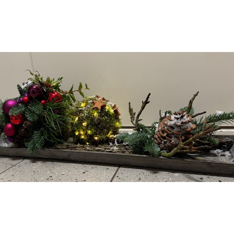 Wij werken dit jaar met decoratieve planten in de kleuren groen met wit; verder is er keuze uit: grillige takken, diverse soorten mos, alle kleuren kerstballen/lint/sierdraad en diverse keuze uit natuurlijke materialen. Hierdoor blijft het Kerststuk zijn sierwaarde houden tot na de kerst. Kerstverlichting kan als extra aanvulling.